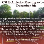 College Station ISD will be opening a new campus, College Station High School, in the fall of 2012. This campus will only be for 9th and 10th graders the first year of operation. Therefore, CSISD must decide what sports to compete at IN THE VARSITY LEVEL for the first two years of operation. CSISD has prepared a short presentation on Wednesday, December 8th at 5:30pm and will be asking for feedback as well as taking questions. The meeting will be at A&M Consolidated High School, in the auditorium.
